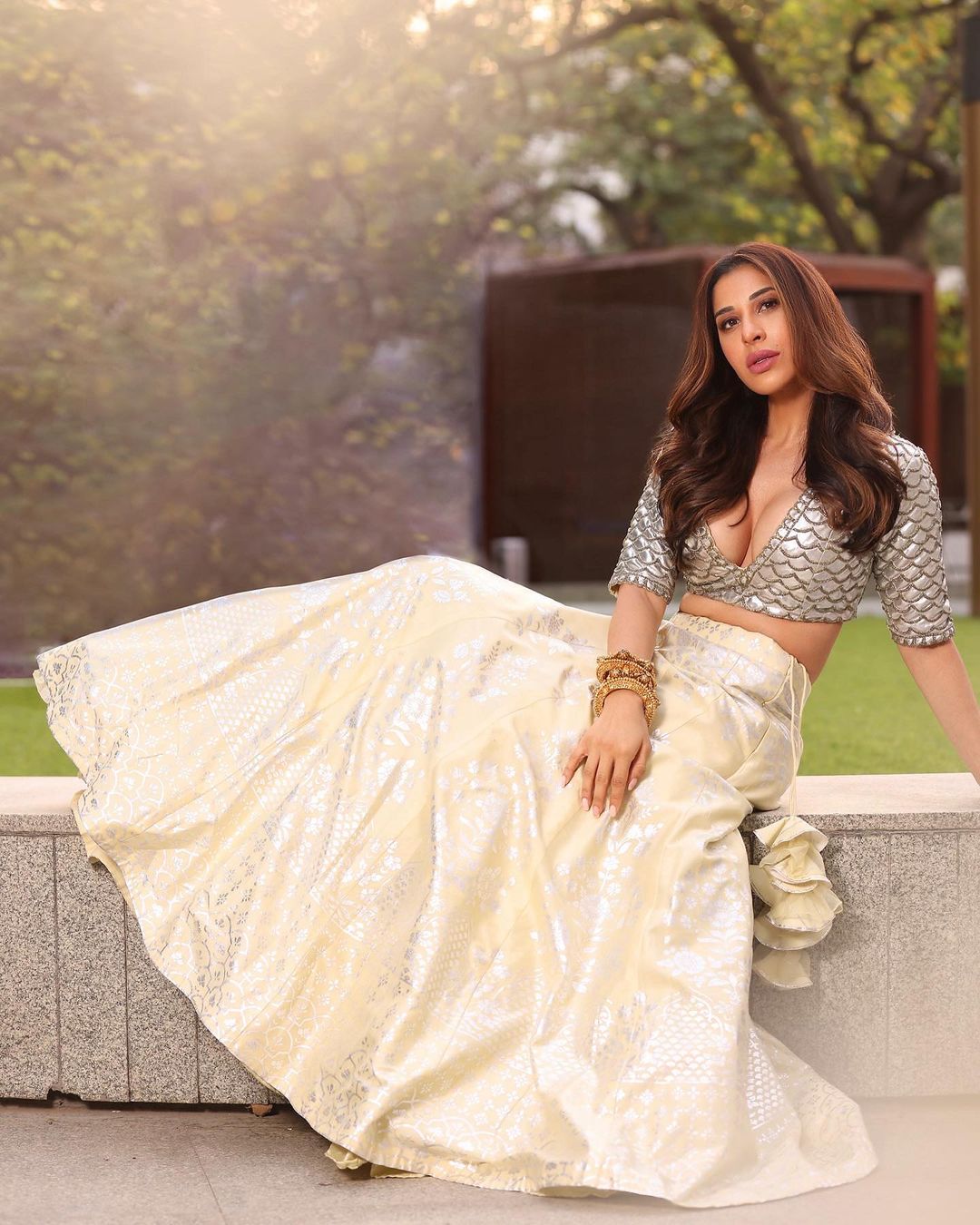 Sophie Choudry looks sizzling in the cleavage-baring blouse and off-white lehenga