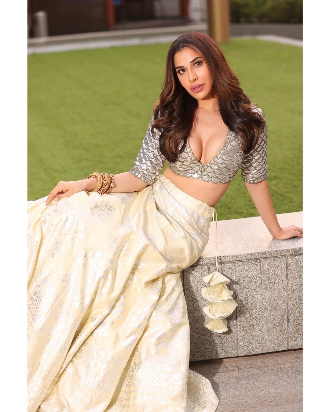 Sophie Choudry looked gorgeous in the draped skirt with an embellished top with a plunging neckline