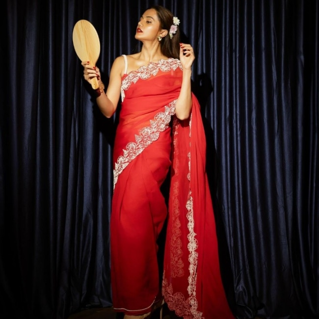 Tapsee Pannu draped a graceful plain red saree with floral applique work