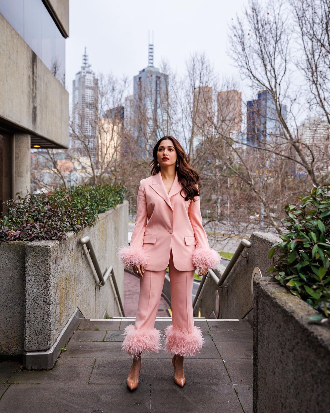 • Tamannaah Bhatia in a pink pantsuit with feather highlights is a gorgeous sight to behold