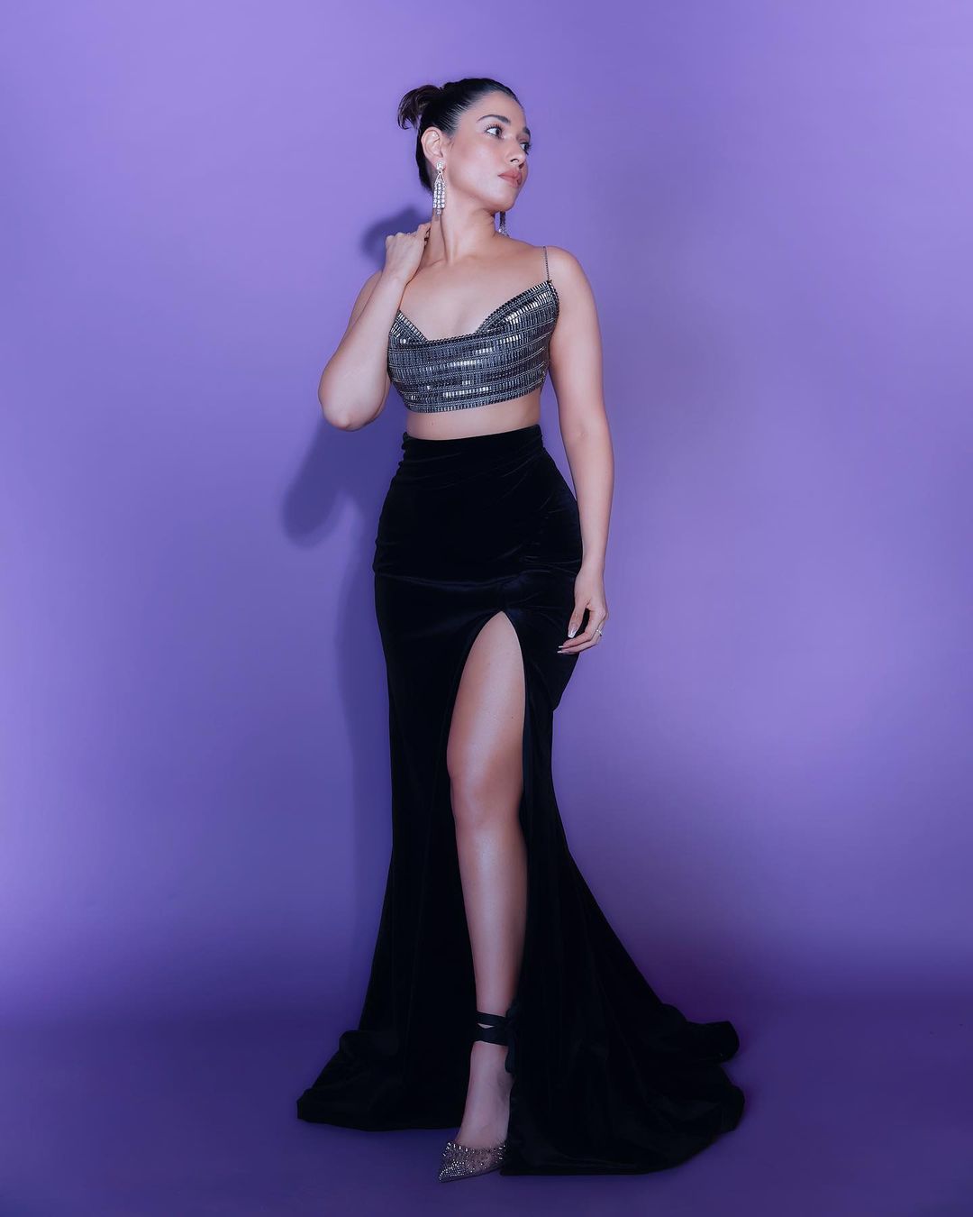 Tamannaah Bhatia looks stylish in the metallic bralette and high-slit black skirt