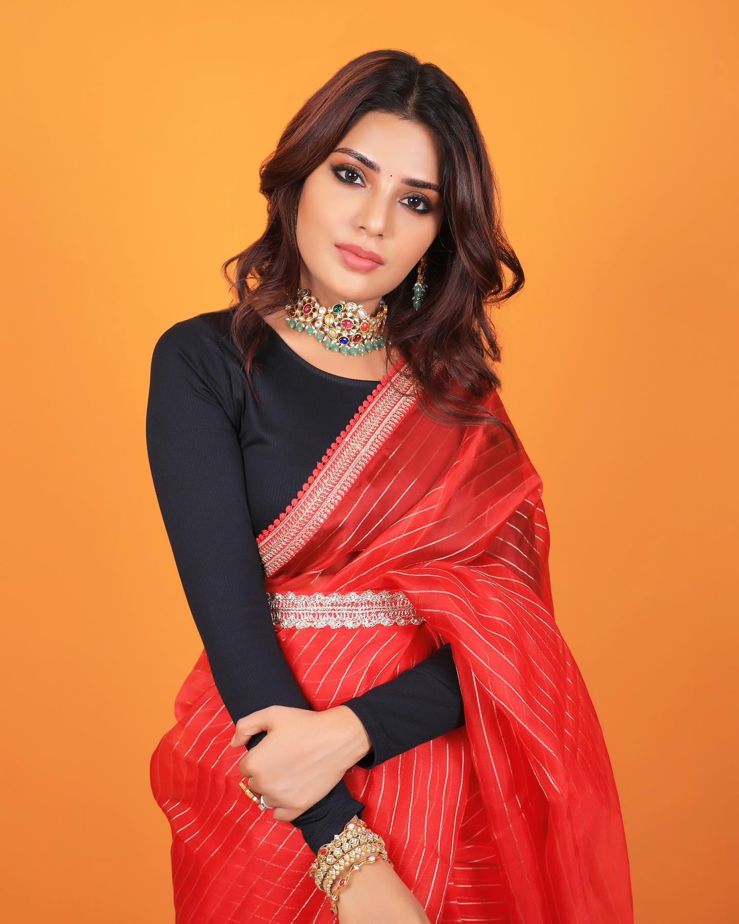 To complete her festive look, Riya adorned herself with classic jewelry pieces that added a touch of royalty.