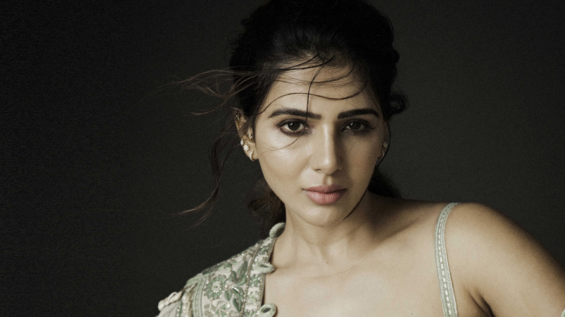actress samantha ruth prabhu is posing for a photo sitting in green wall background wearing black green design dress hd girls