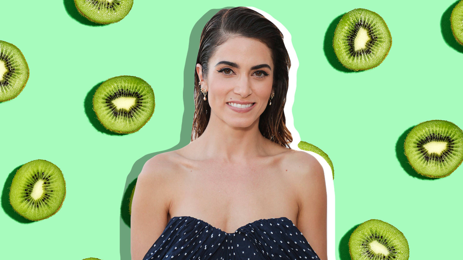 A Bewitching Poster Of A Female Star Nikki Reed Wearing A Black Dotted Dress And Smiling With A Green Kiwi Fruit Backdrop