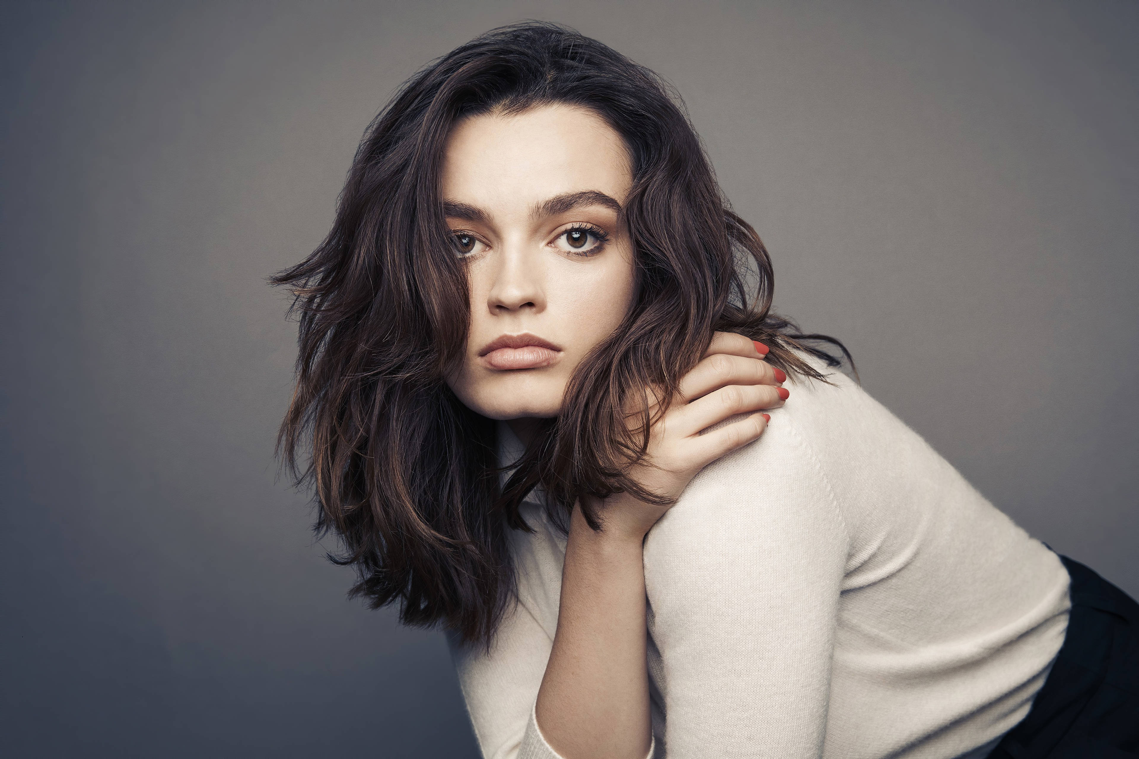 A Fashion Page With French Celebrity, Emma Mackey, Posing With A Neutral Outfit And Makeup, And Red Nails.